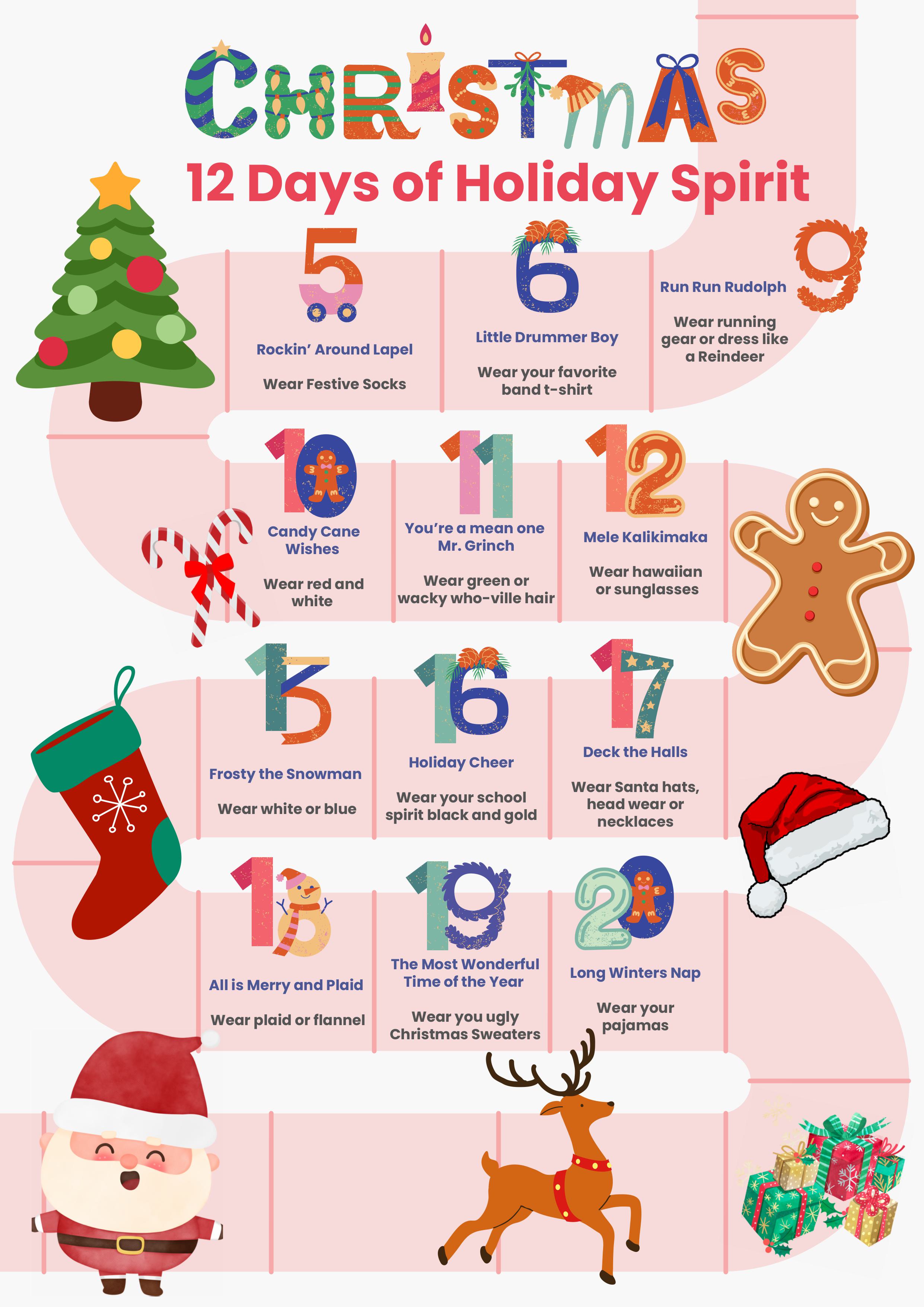 Please find attached out Christmas 12 Days of Holiday Spirit! We will have dress up days starting this Thursday, December 5th.Thanks so much!